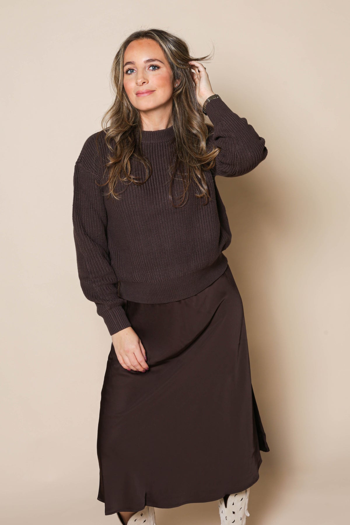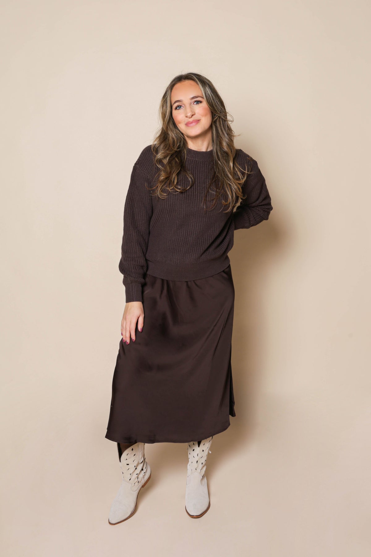 Ein stilvoller Ton-in-Ton-Look ist immer eine gute Wahl! Spiele mit verschiedenen Materialien, um deinem Outfit noch mehr Ausdruck zu verleihen. In diesem Look kombinieren wir einen gehäkelten Pullover mit einem Satin-Look-Rock in derselben tiefbraunen Farbe. Abgerundet wird das Outfit mit einem verspielten Stiefel.