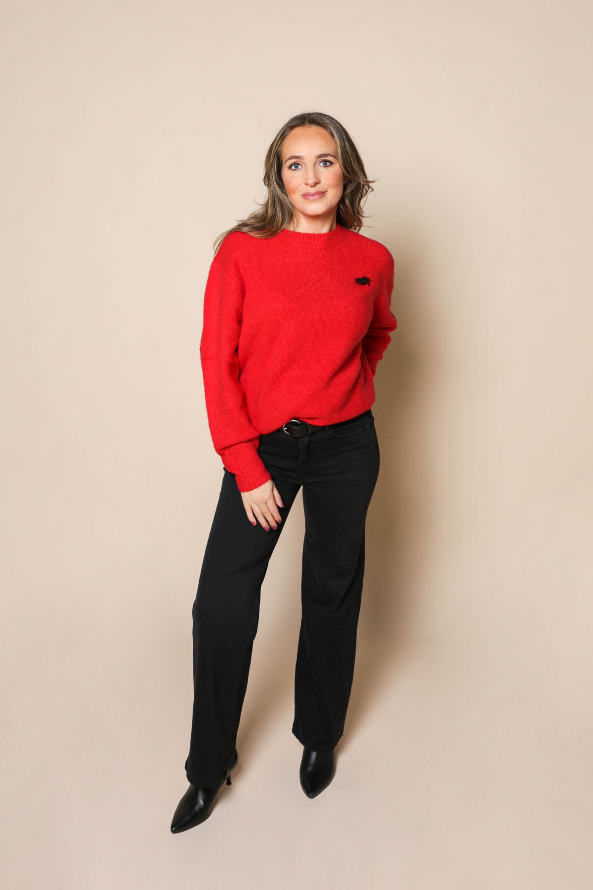 Eine knallige Farbe wie Rot ist ein echter Hingucker in deinem Look. Dieser schöne Pullover hat zudem ein verspieltes Detail – eine hübsche Brosche. Vervollständige das Outfit mit einer stilvollen Jeans und einem schicken Gürtel als zusätzliches Highlight.